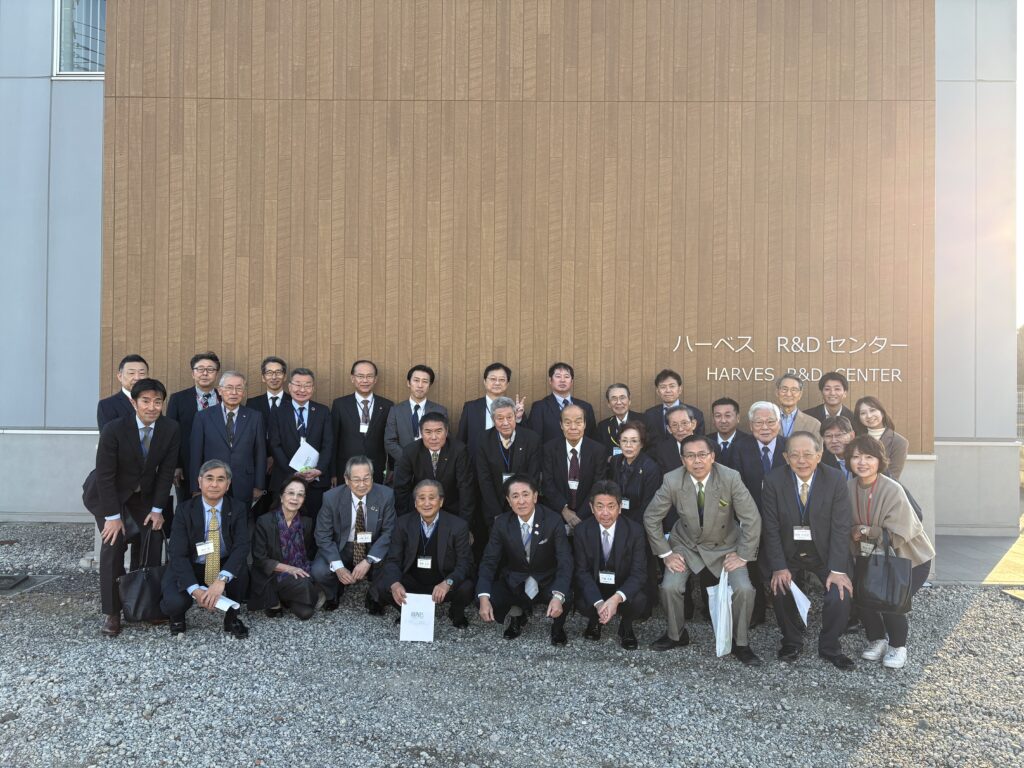 令和7年12月17日(水)、経済活性化委員会・産業交流部会主催の新企画「会員企業視察会」を「会員企業を知ろう」をテーマに開催、会員等33名に参加いただきました。視察先は、自動車、電気・電子機器などに使用される特殊潤滑剤のメーカーとして幅広い分野に製品を提供している株式会社ハーベス伊奈工場と、粉末冶金に特化して70年以上の歴史を誇り小型モータ用軸受では国内トップシェアを誇るポーライト株式会社伊奈工場。株式会社ハーベスでは同社代表取締前田知憲氏の歓迎挨拶の後、取締役生産本部長の田中祥生氏から会社概要等の説明をいただき、その後4班に分かれて伊奈工場及び併設するR&Dセンターを視察しました。ポーライト株式会社では同社代表取締役社長菊池正史氏の歓迎挨拶の後、執行役員管理統括部長の橋本浩二氏から会社概要等の説明をいただき、その後3班に分かれて伊奈工場を視察しました。視察後は明治27年に「酒蔵 文楽」として埼玉県上尾市で日本酒の醸造を始めた北西酒造と、蕎麦と一品料理の店「東蔵」が2008年に開業した「文楽東蔵」にて懇親会を開催、会員同士交流を図ることが出来ました。日頃各種会合等で会員同士の面識はあっても会社の事業内容等はよくわからないというケースも多く、本視察会を通して2社の事業内容を知るとともに、自社のビジネスへのヒントを得ることが出来た視察会となりました。