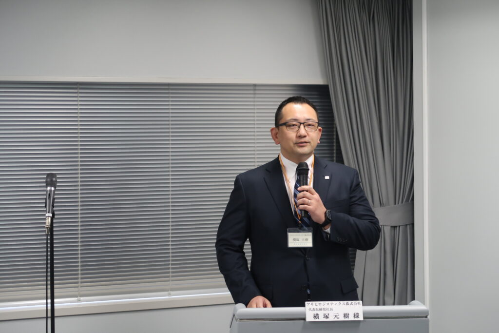 令和8年1月28日(水)、企業経営委員会「ビジネスプラン発表会(リアル&オンライン)」を「『変革』に向けた会員企業の取組を学ぼう!」をテーマに開催、33名(リアル24名・オンライン9名)に参加いただきました。当日はアサヒロジスティクス株式会社代表取締役社長の横塚元樹氏から「わが社の人財戦略」について、株式会社デサン代表取締役社長の藤池一誠氏から「サイバーフィジカル超高度融合企業体への挑戦」と題してビジネスプランを発表いただきました。